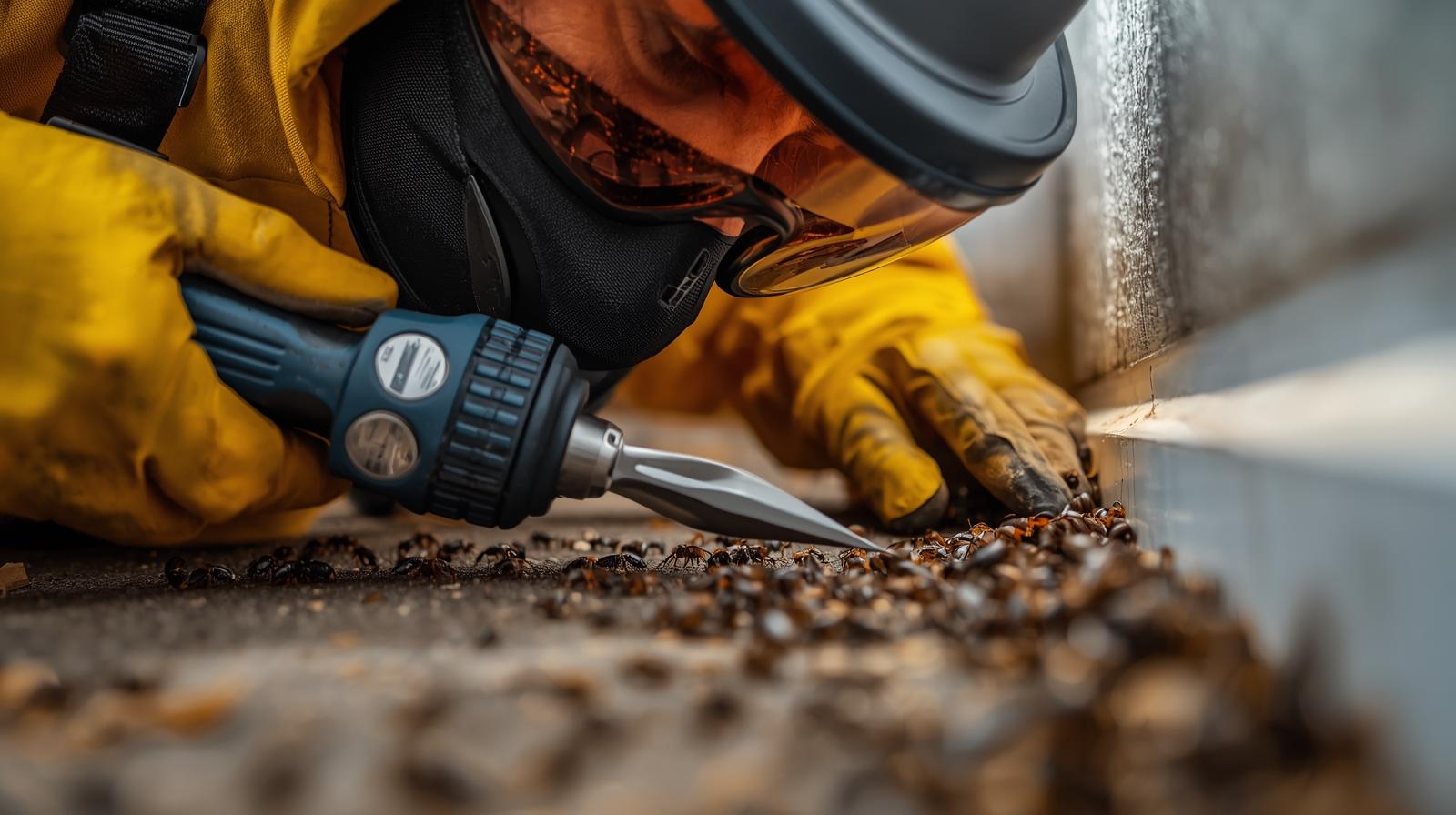 فريق فني متخصص يقوم بمسح شامل للموقع باستخدام أجهزة كشف متقدمة لتحديد أماكن وجود المستعمرات وحجم الضرر. - المعالجة الكيميائية الموضعية